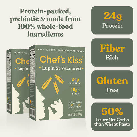 Chef’s Kiss is so much more than just pasta-  it’s a nutrient dense meal for less than $3 per serving.  Each serving is packed with protein, gut friendly prebiotic fiber, amino acids, essential vitamins and minerals, and so much more!  Our protein rotini is highly satiating too and a single box can feed a family of 4.  We don’t cut any corners when it comes to producing our products. We source premium lupins directly from farms in Australia and Peru and don’t use any filler flours or processed starches like other lupin pasta companies.